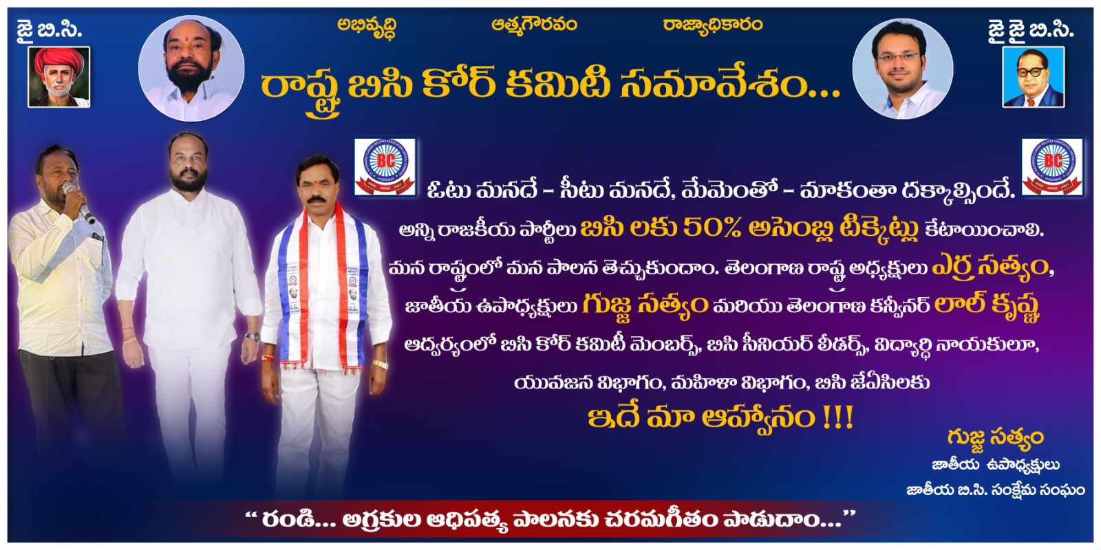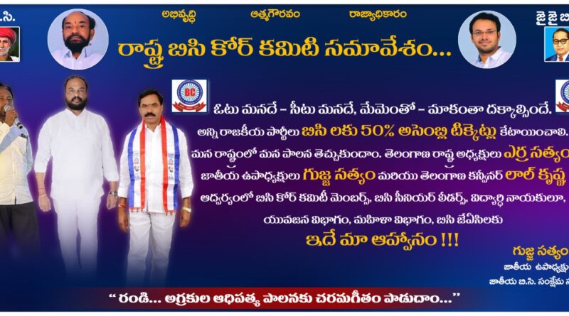 నేడే రాష్ట్ర బీసీ కోర్ కమిటీ సమావేశం – అన్ని రాజకీయ పార్టీలు వచ్చే ఎన్నికల్లో 50శాతం టికెట్లు కేటాయించాలని జాతీయ బీసీ సంక్షేమ సంఘం ఉపాధ్యక్షుడు గుజ్జ సత్యం డిమాండ్.